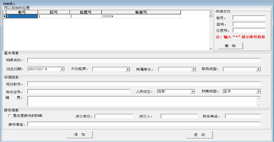 檔案入庫,是對檔案進行錄入,檔案名稱為必填信息。可以存放的位置:是顯示目前檔案柜中空余的位置信息。如果是接收的檔案,請選擇“是否是接收的檔案”選擇框,并填寫信息,其中送交單位和送交人為必填信息。