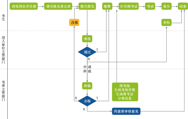 - 用人單位主管部門在線完成考生報名的資格審核、仲裁、崗位撤銷(考生人數(shù)不足)、考生資料查詢。